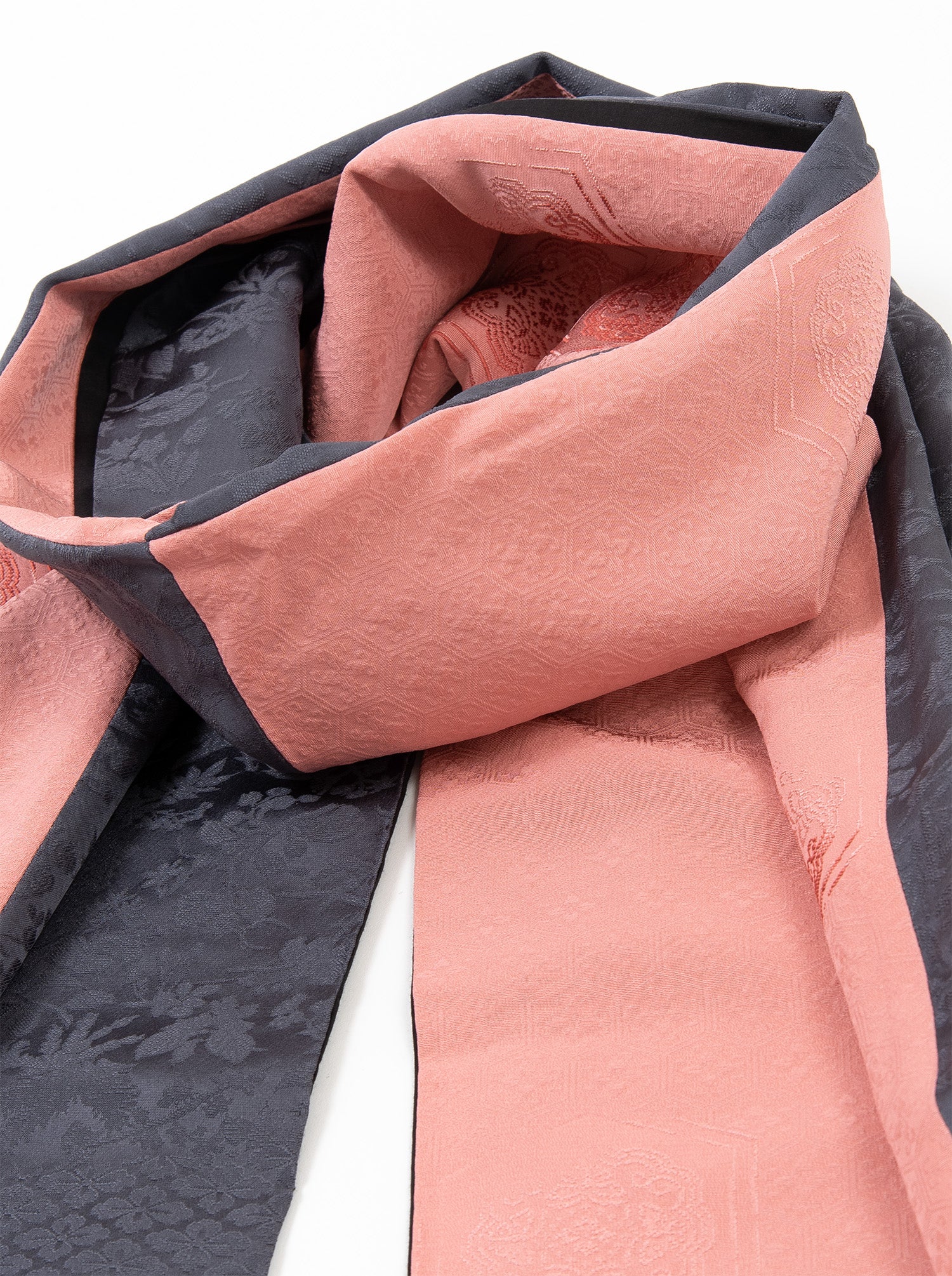 元は羽織や袷(あわせ)、雨コートや単衣(ひとえ)などだった着物を解体し作られています。元来の着物文化が持つ魅力の一つでもある「色合わせ」や「柄合わせ」でこれでもかと遊んだ、魅力溢れるストールとなりました。
