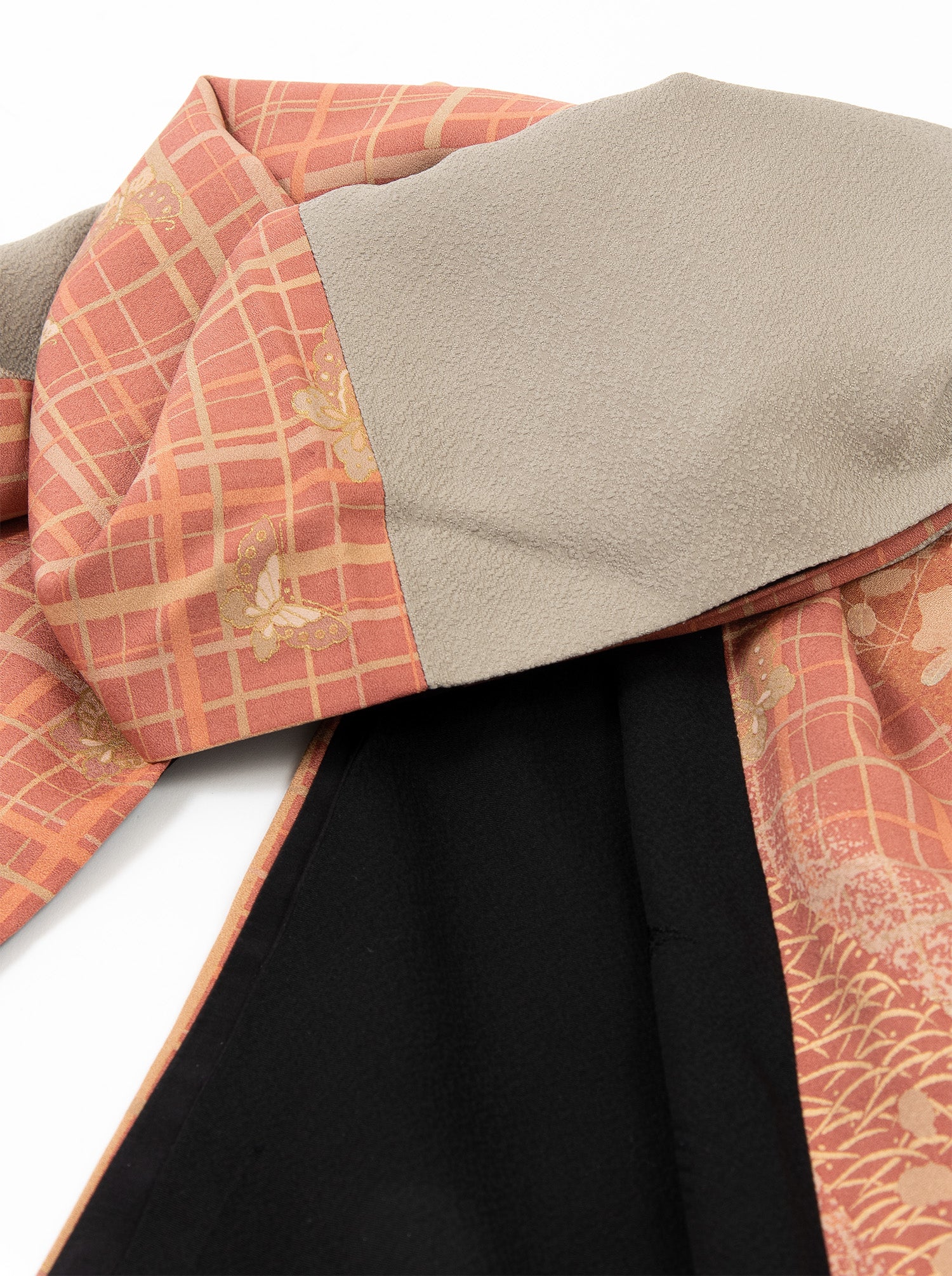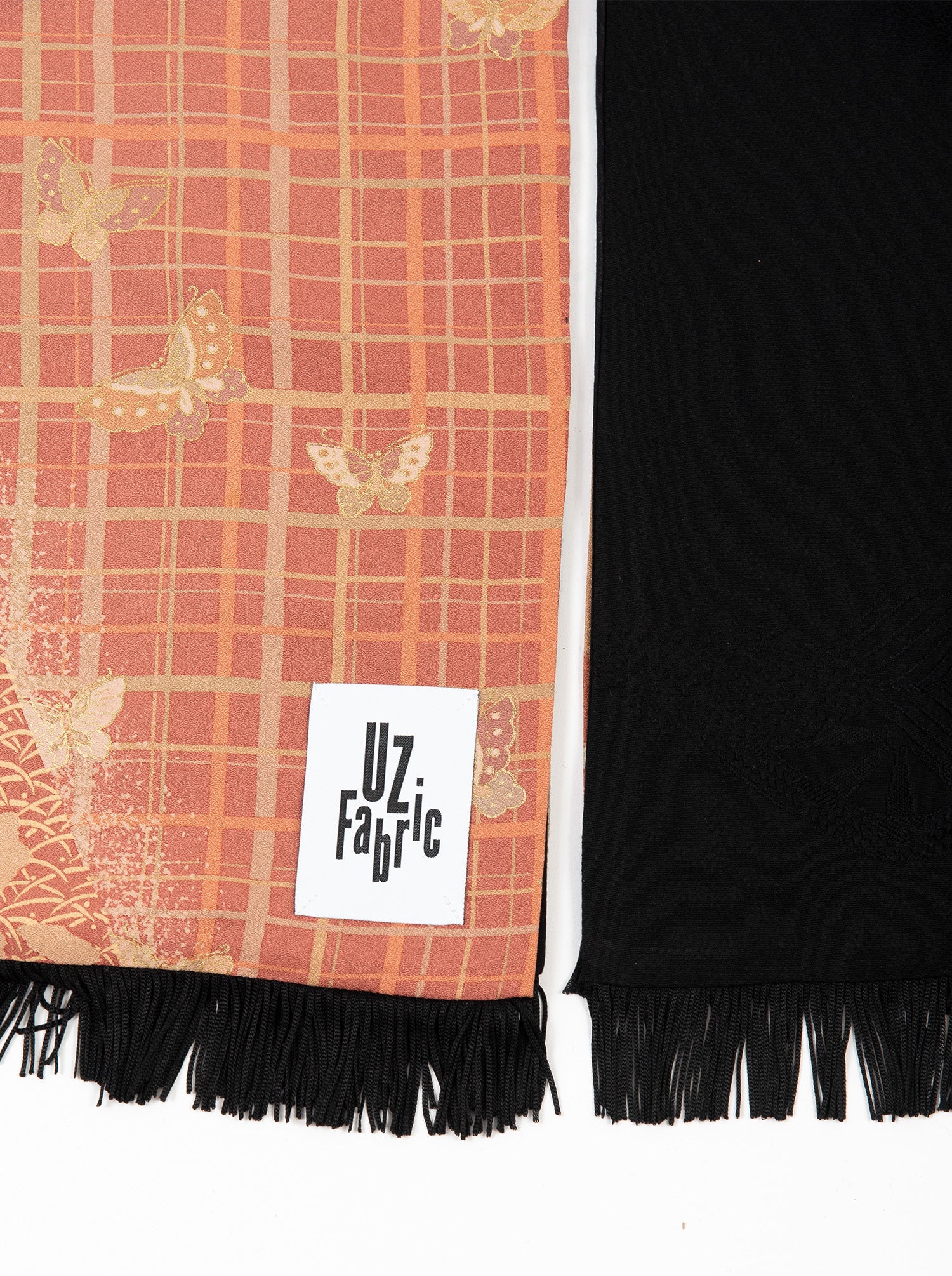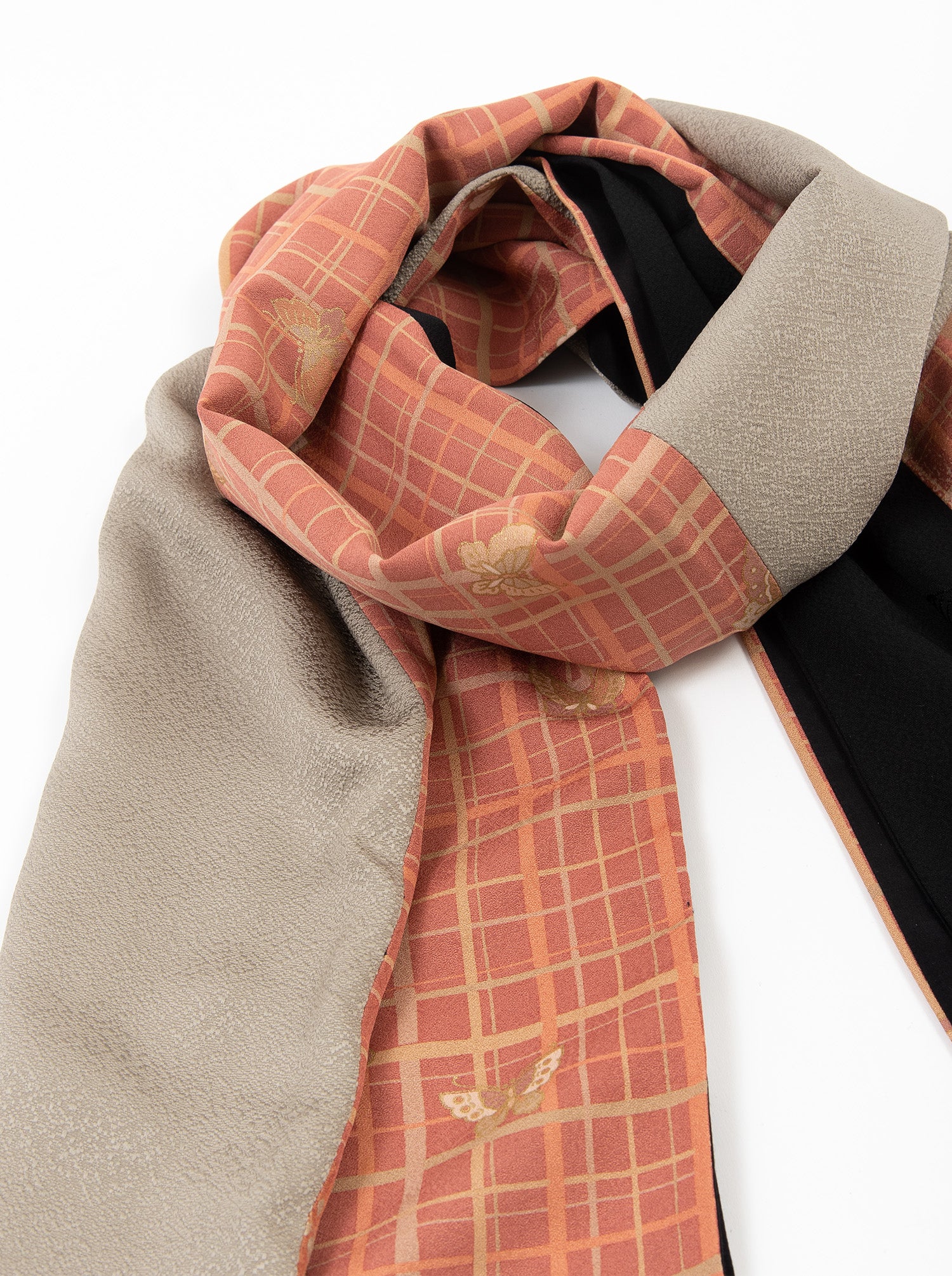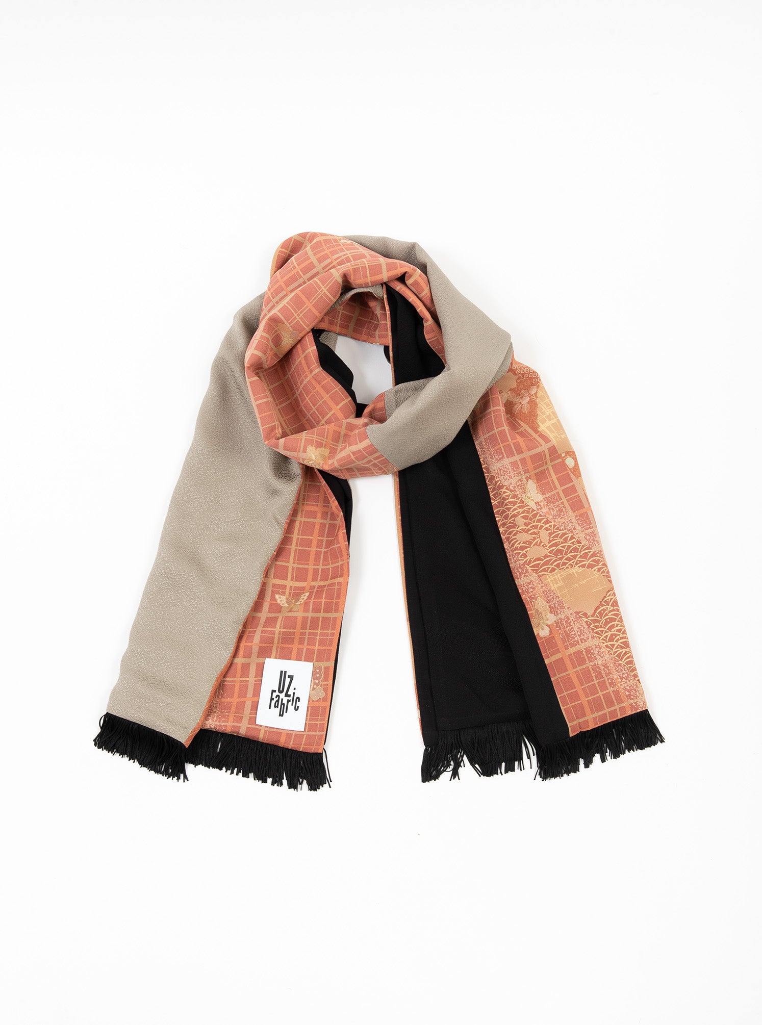 元は羽織や袷(あわせ)、雨コートや単衣(ひとえ)などだった着物を解体し作られています。元来の着物文化が持つ魅力の一つでもある「色合わせ」や「柄合わせ」でこれでもかと遊んだ、魅力溢れるストールとなりました。