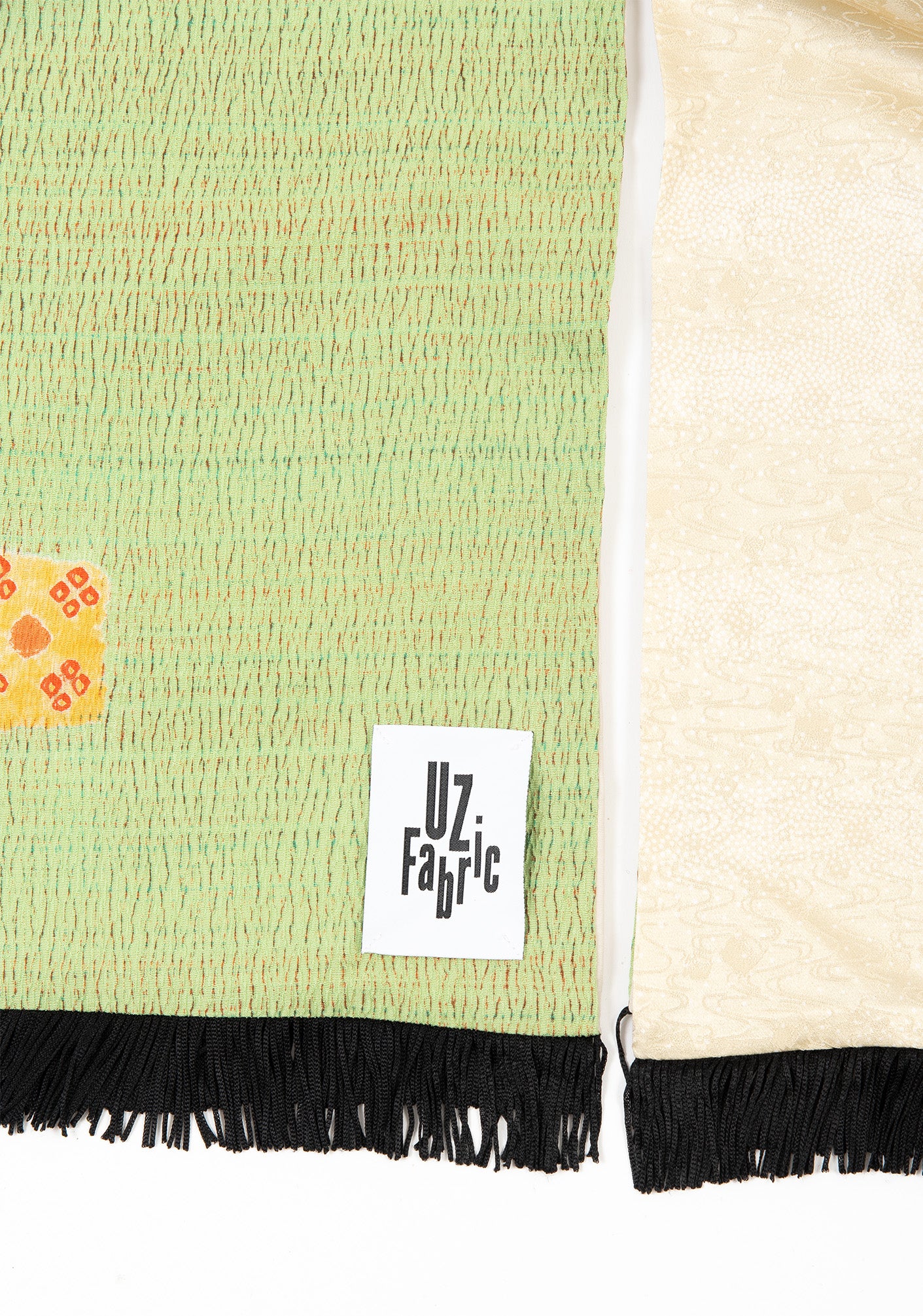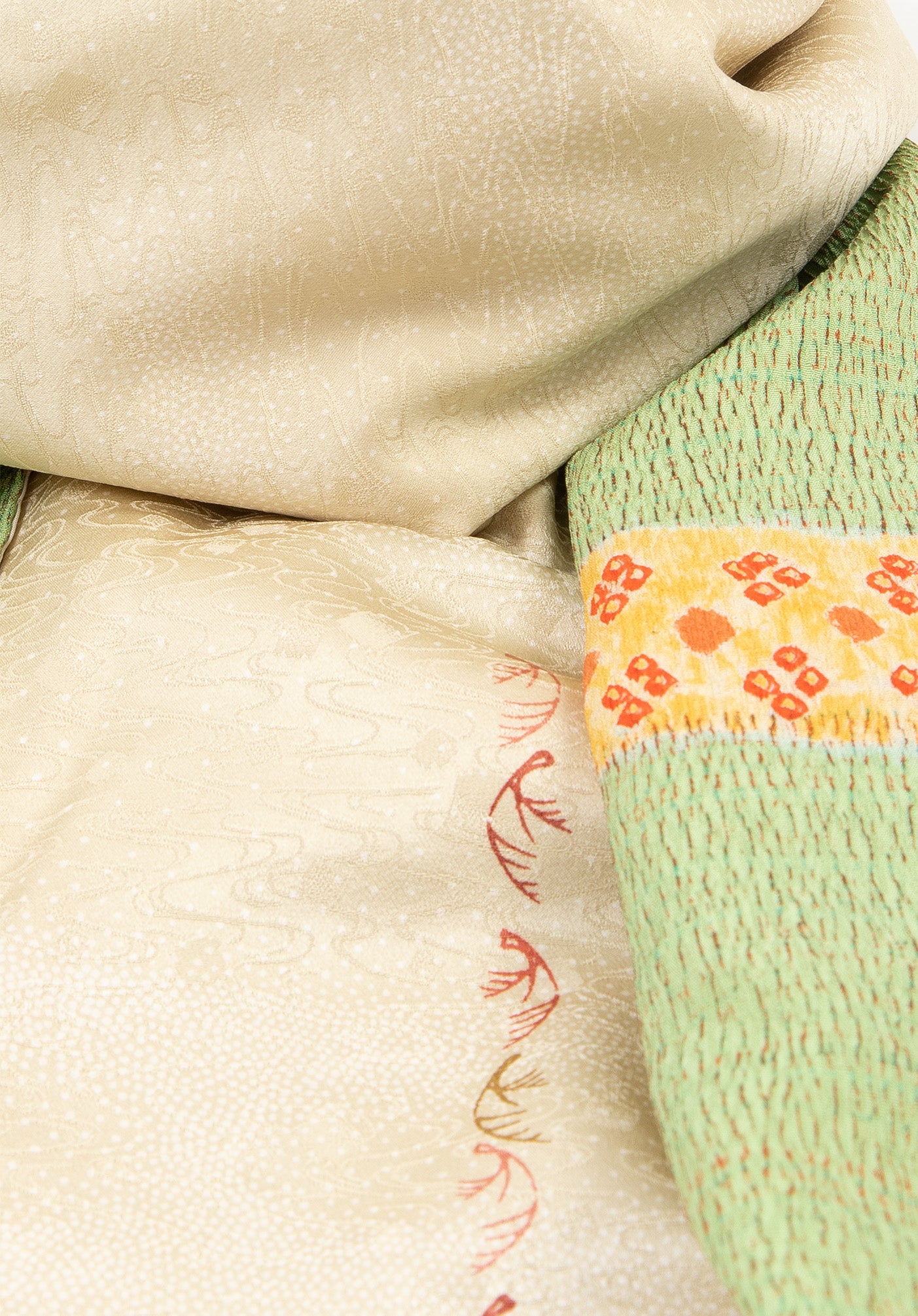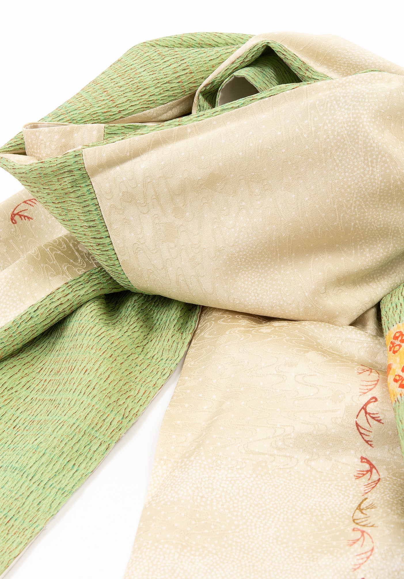 元は羽織や袷(あわせ)、雨コートや単衣(ひとえ)などだった着物を解体し作られています。元来の着物文化が持つ魅力の一つでもある「色合わせ」や「柄合わせ」でこれでもかと遊んだ、魅力溢れるストールとなりました。