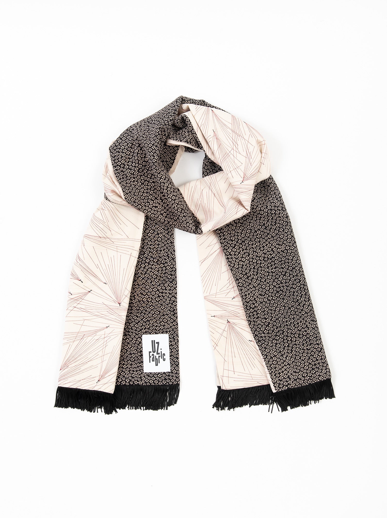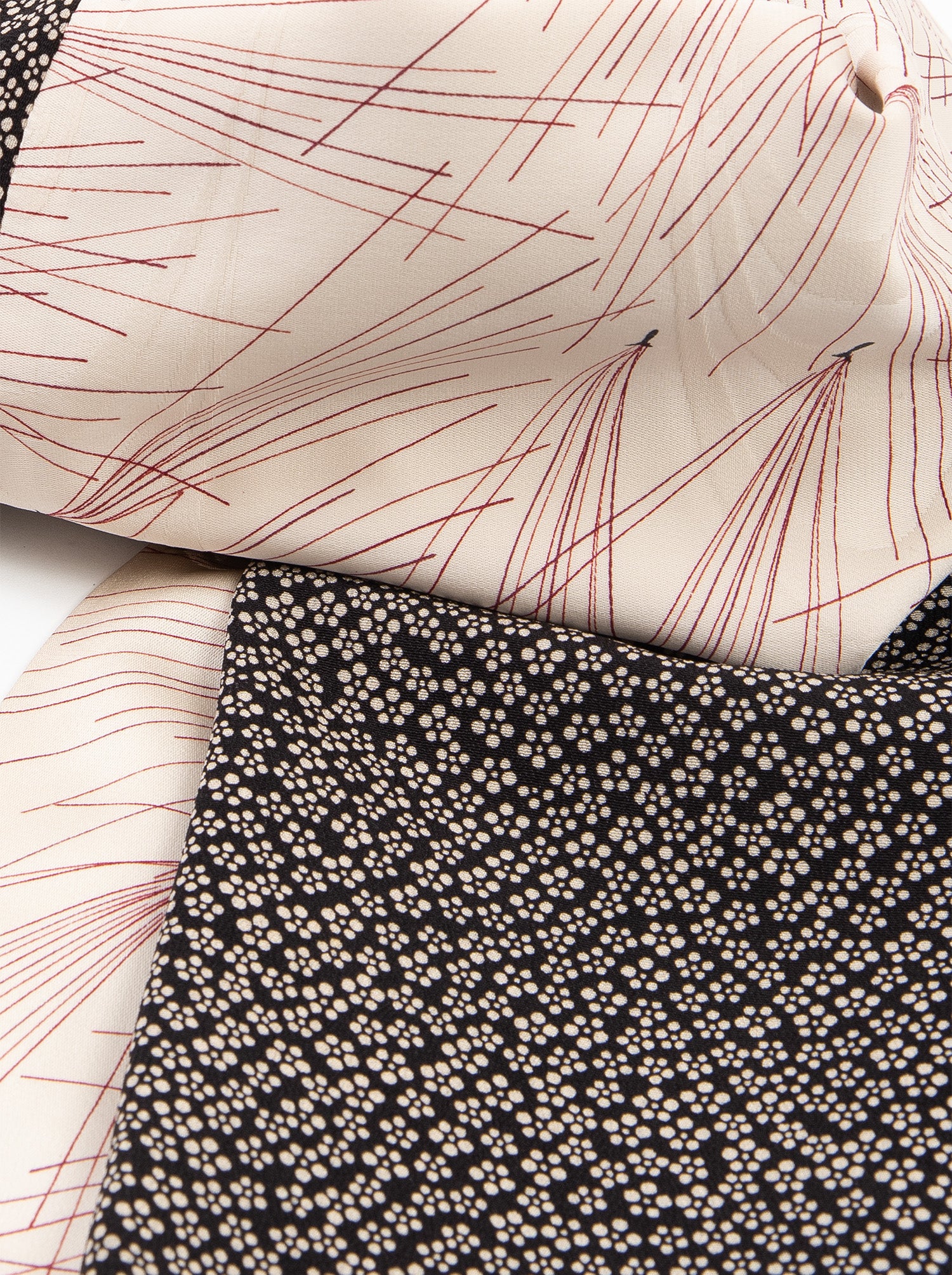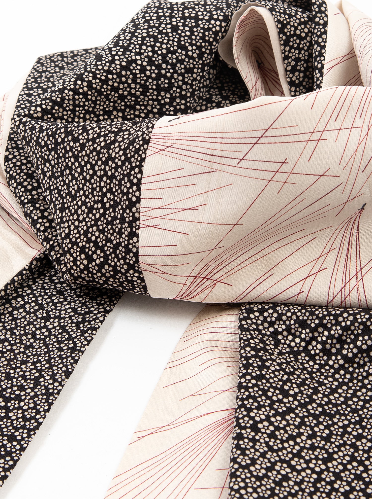 元は羽織や袷(あわせ)、雨コートや単衣(ひとえ)などだった着物を解体し作られています。元来の着物文化が持つ魅力の一つでもある「色合わせ」や「柄合わせ」でこれでもかと遊んだ、魅力溢れるストールとなりました。