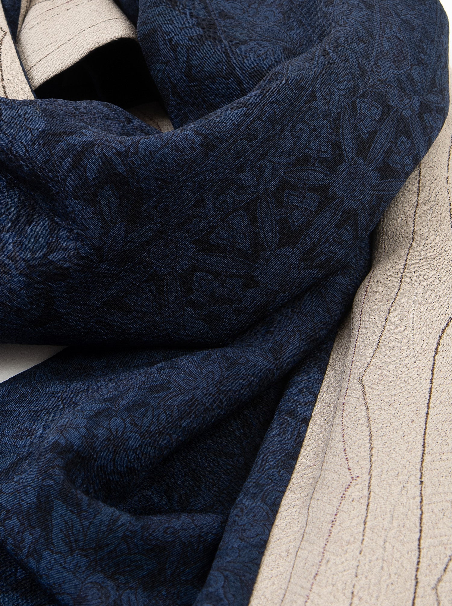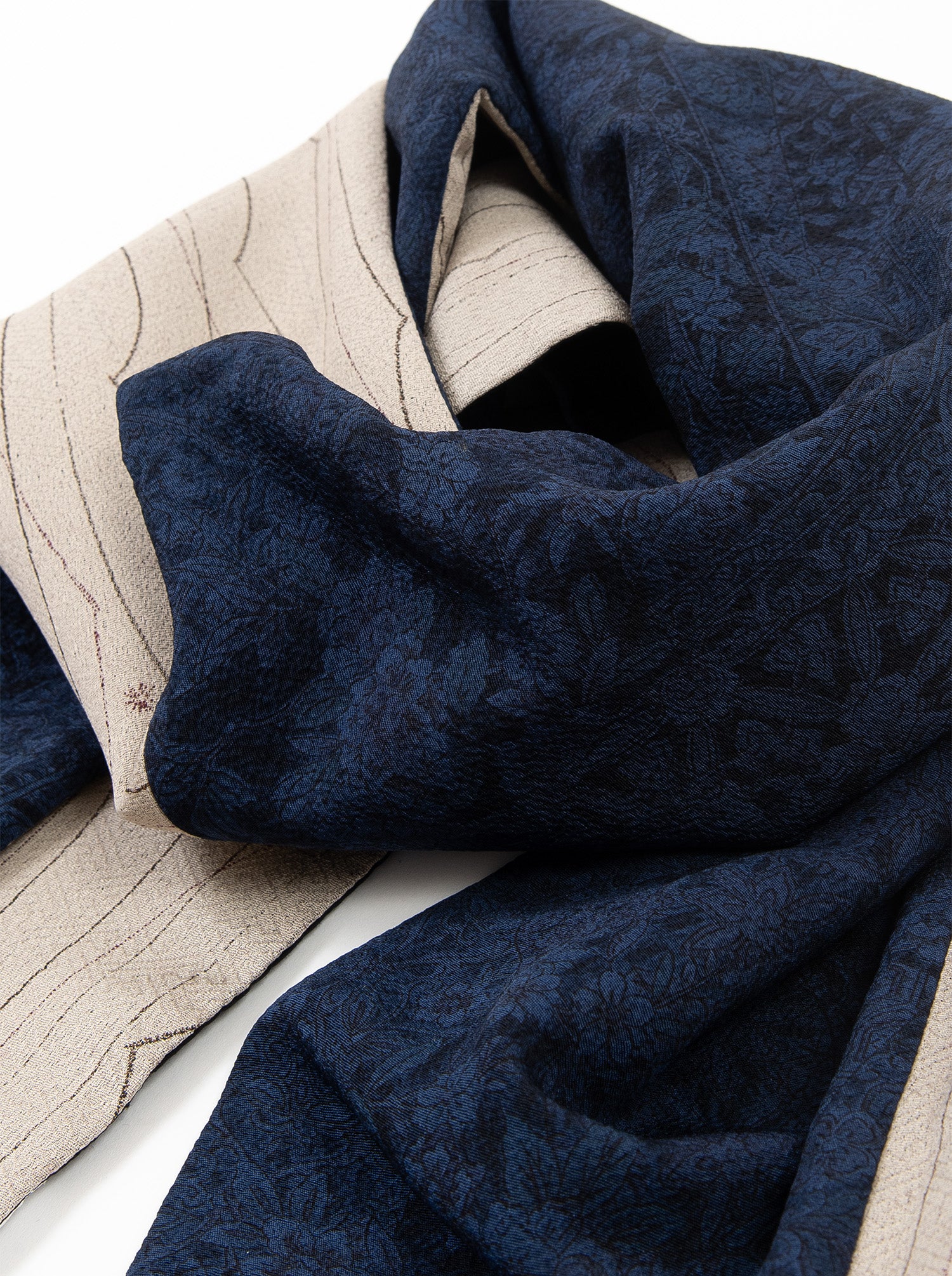 元は羽織や袷(あわせ)、雨コートや単衣(ひとえ)などだった着物を解体し作られています。元来の着物文化が持つ魅力の一つでもある「色合わせ」や「柄合わせ」でこれでもかと遊んだ、魅力溢れるストールとなりました。