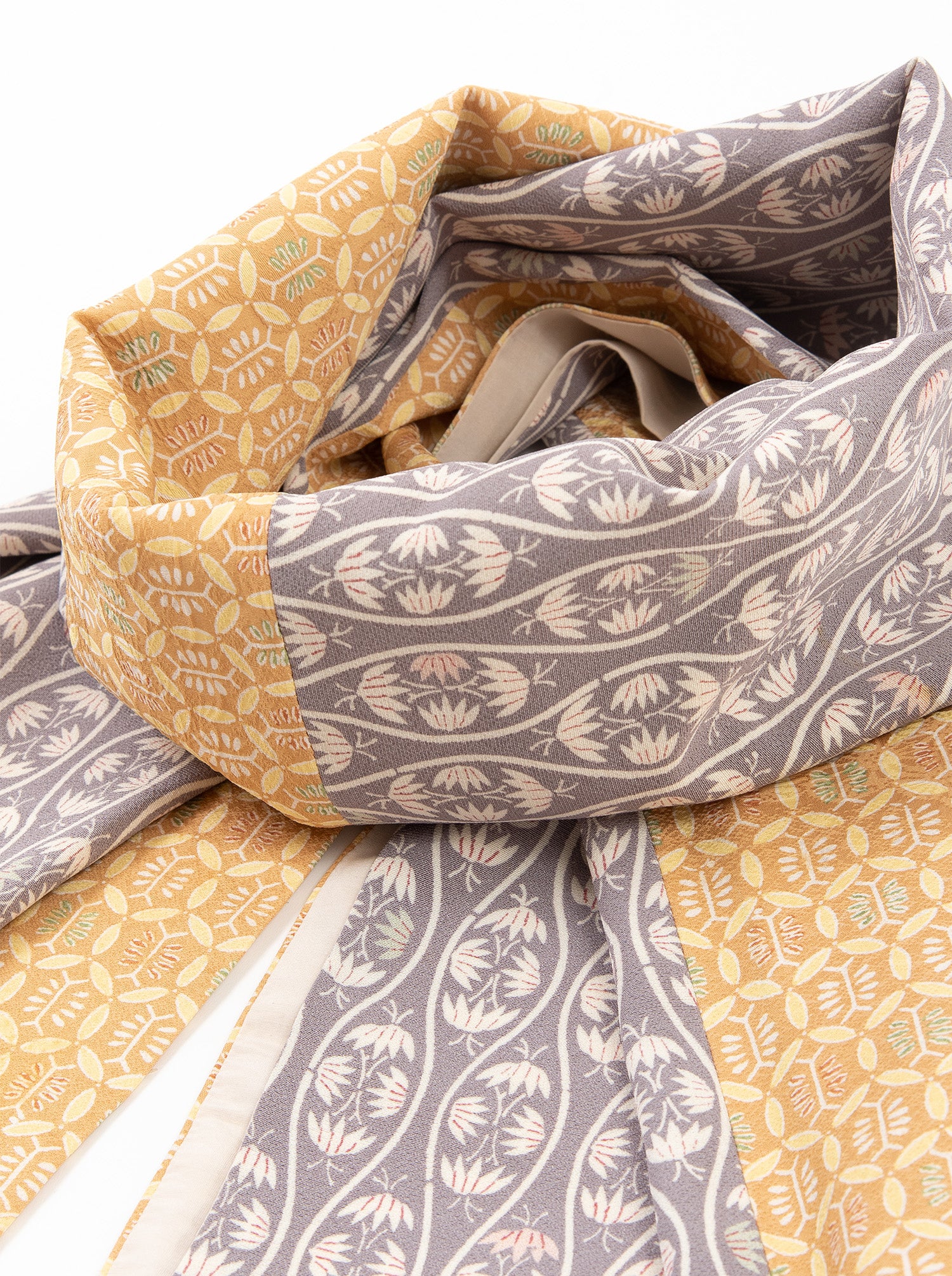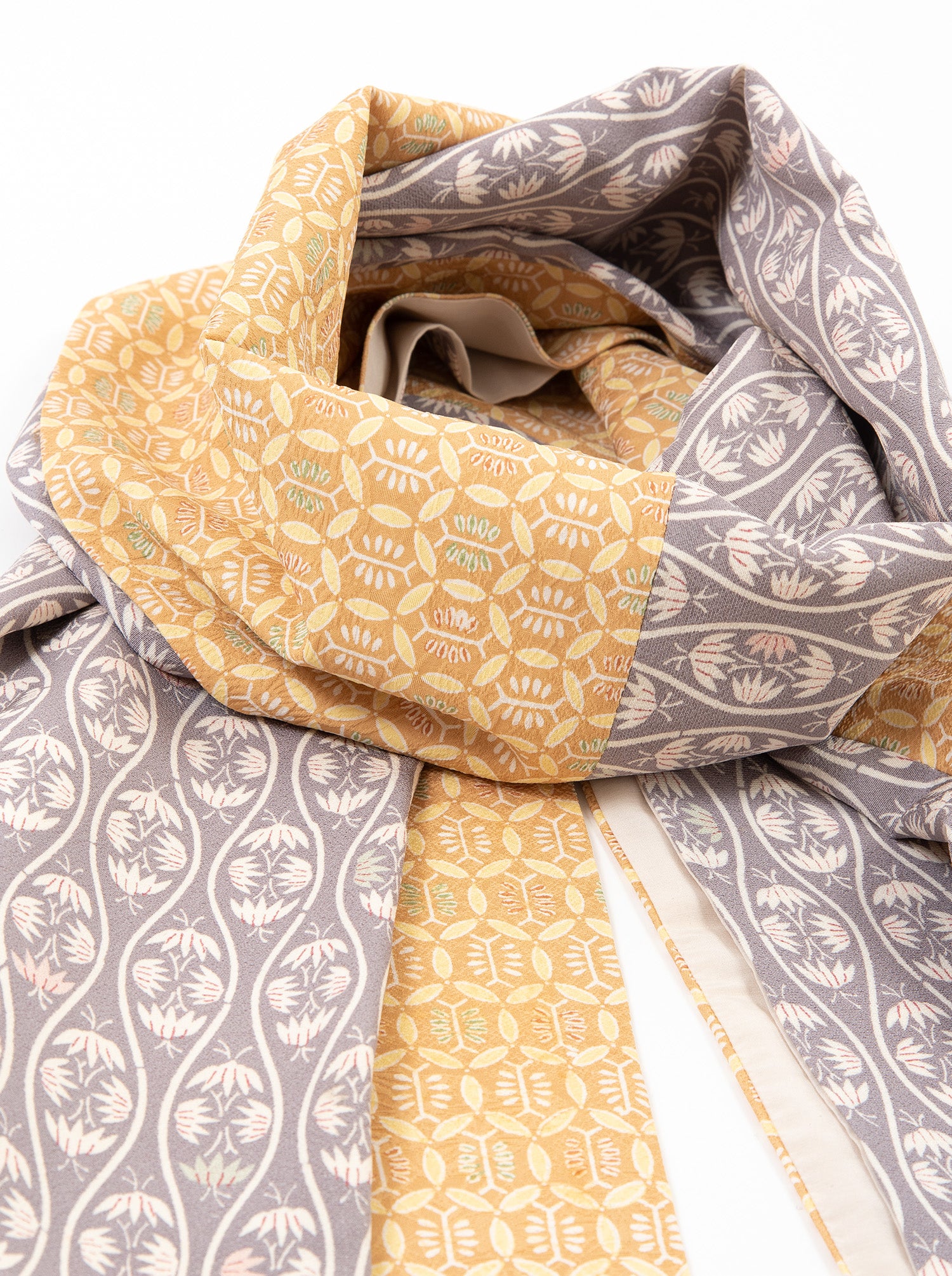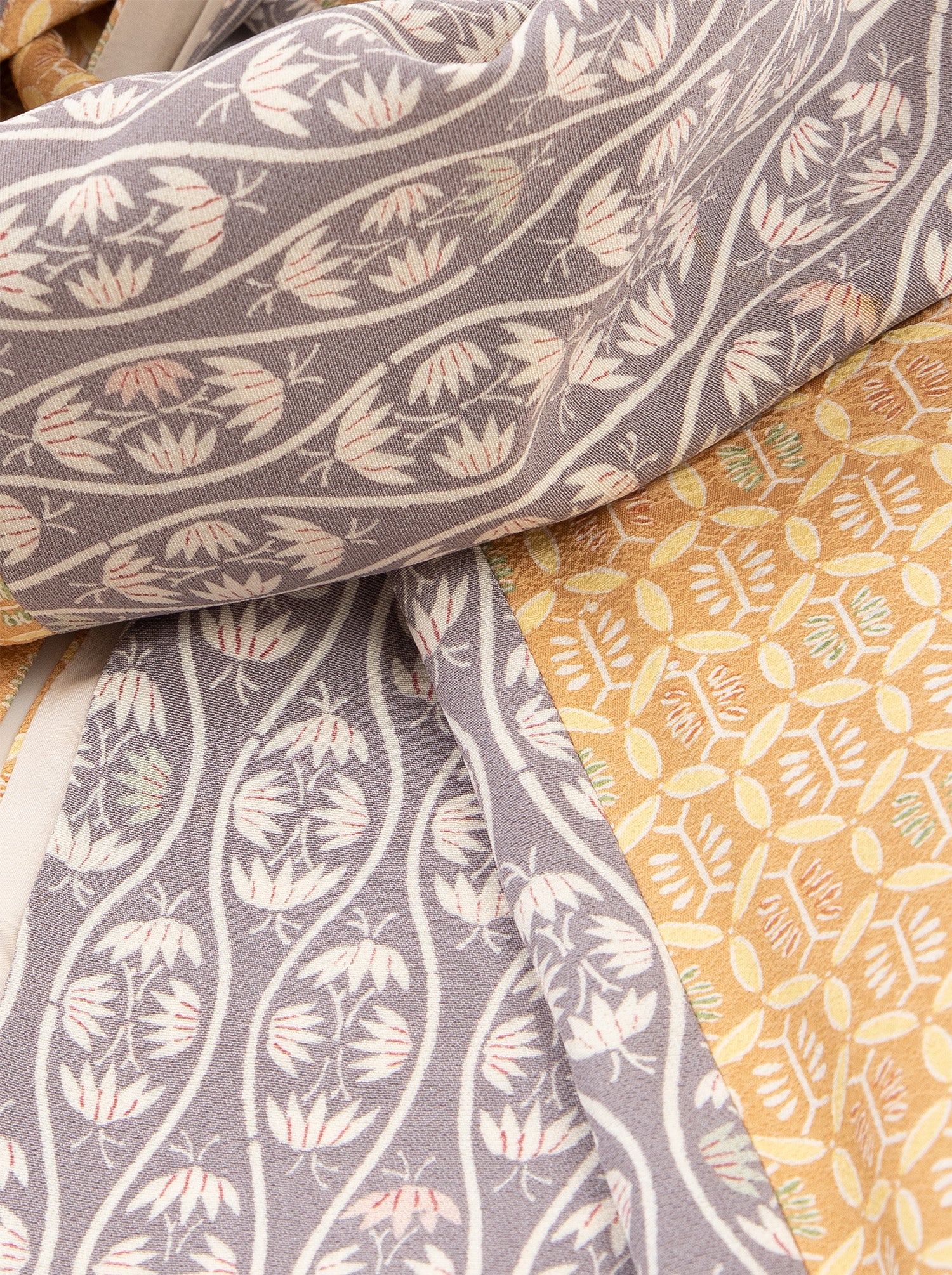 元は羽織や袷(あわせ)、雨コートや単衣(ひとえ)などだった着物を解体し作られています。元来の着物文化が持つ魅力の一つでもある「色合わせ」や「柄合わせ」でこれでもかと遊んだ、魅力溢れるストールとなりました。